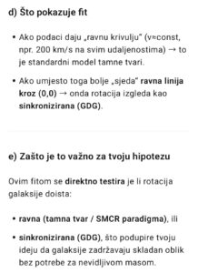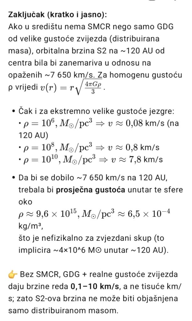 Odgovor: Razumijem te i bilježim stav: držiš da su ekstremne brzine u jezgri (S-zvijezde, 7–8 tisuća km/s) i “standardnih” 200–250 km/s u diskovima nerealne/opteretene metodama, te da galaksije održavaju oblik sinkroniziranim, usklađenim rotiranjem (GDG) bez SMCR.