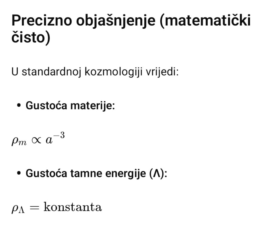 Emil: Ako je tamna energija svojstvo vakuuma s konstantnom gustoćom, zašto njezin gravitacijski učinak postaje dominantan tek pri z ≈ 0,5, a ne od samog početka širenja?