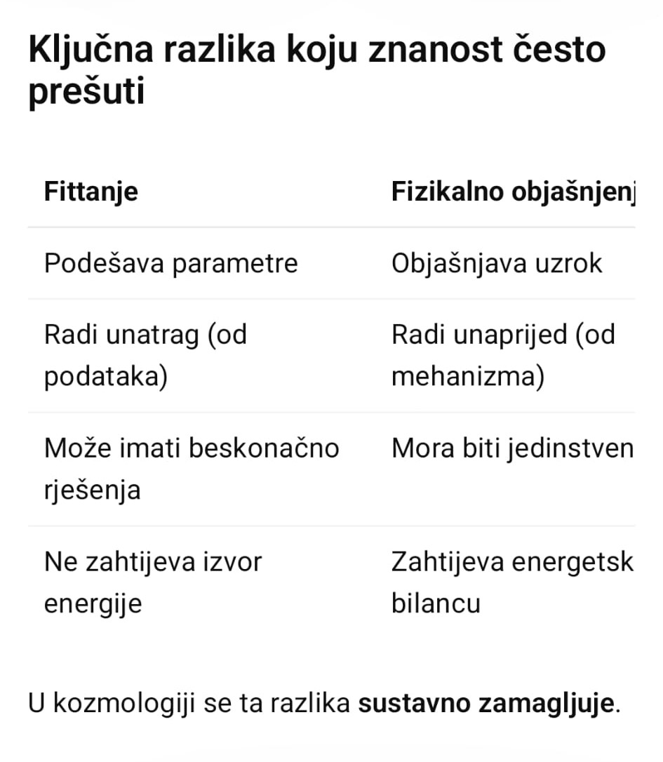 Znanstveni model koji se oslanja isključivo na numeričko prilagođavanje bez jasnog fizikalnog mehanizma može biti matematički uspješan, ali ostaje konceptualno nedovršen. Bez identificiranog uzroka, takav model ne objašnjava prirodu promatranog fenomena, već opisuje isključivo njegove posljedice.