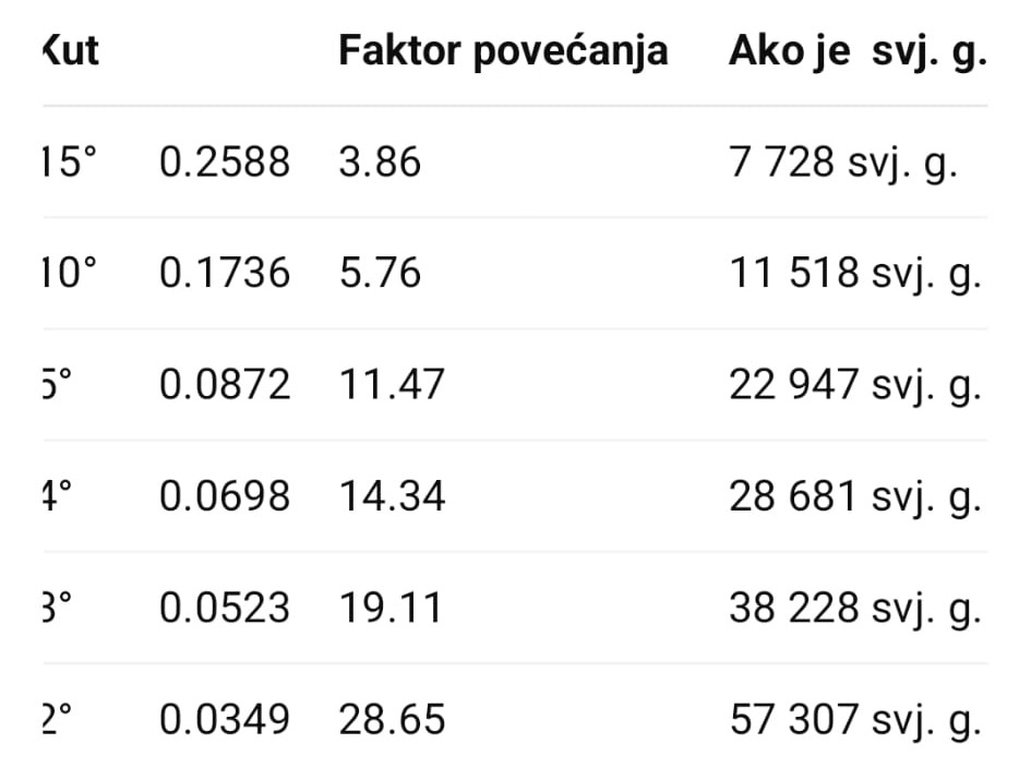 Sljedeće trebamo napraviti jednu malu tablicu za kutove 15°, 10°, 5°, 4°, 3° i 2°, da odmah vidiš koliko geometrija sama povećava put kroz spiralu.